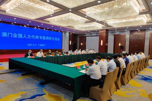 2022年9月5日至9日,澳门全国代表赴广西开展专题调研。图为自治区党委、自治区常委会从任会见调研组一行时合影。摄影/杨夏怡。
