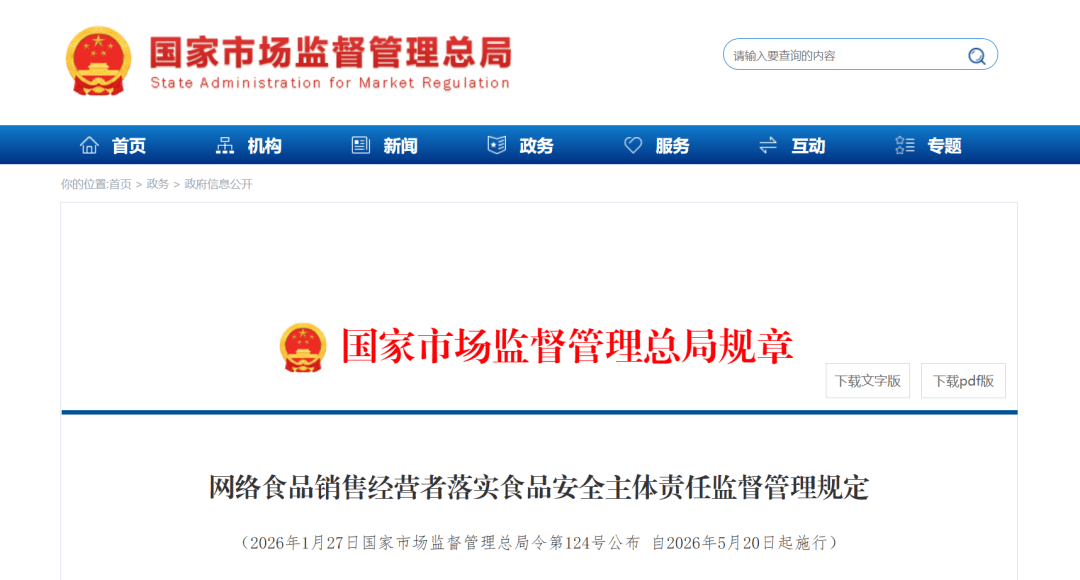第一条 为了加强收集发卖食物平安监视办理,督促收集食物发卖运营者落实食物平安从体义务,食物平安,按照《中华人平易近国食物平安法》、《中华人平易近国电子商务法》等法令、行规,制定本。第二条 正在中华人平易近国境内,收集食物发卖运营者依法落实食物平安从体义务的行为及其监视办理,合用本。本所称收集食物发卖运营者包罗收集食物买卖第三方平台供给者(以下简称平台供给者)和通过收集食物买卖第三方平台、自建网坐或者其他收集办事发卖食物的食物出产运营者(以下统称入网食物发卖者)。第 处置收集食物发卖勾当,该当恪守国度食物平安和电子商务相关法令律例,诚信自律,接管监管和社会监视。第四条 收集发卖食物平安监视办理该当风险防止、底线、贯通监管、协同管理的准绳,加强全链条监视办理,保障全过程食物平安。除本对收集发卖食物平安监视办理权限还有外,省级市场监视办理部分能够按照收集食物发卖运营者的运营规模和食物平安风险情况,并连系食物平安风险办理现实,确定本行政区域内各级市场监视办理部分的收集发卖食物平安监视办理权限。第六条平台供给者该当明白担任食物平安办理的机构,配备取收集发卖食物平安办理现实相顺应的食物平安总监、食物平安员等办理人员,并明白其具体岗亭职责;未配备食物平安总监的,食物平安总监职责由平台供给者指定的食物平安员履行。平台供给者次要担任人对本平台食物平安工做全面担任,支撑、保障和督促食物平安总监、食物平安员等办理人员开展收集发卖食物平安办理工做;正在做出涉及食物平安的严沉决策前,该当充实听取食物平安总监、食物平安员等办理人员的看法和。第七条平台供给者该当成立健全食物平安培训查核机制,按期对食物平安总监、食物平安员等办理人员开展法令律例和食物平安学问培训、查核,提拔收集发卖食物平安风险防控能力。处事处、第三方机构等,下同)处置收集发卖食物平安办理的,该当自设立或者委托之日起三十个工做日内,向现实运营机构所正在地省级市场监视办理部分演讲。演讲内容包罗现实运营机构的名称、地址、代表人或者担任人姓名、联系体例等。平台供给者该当制定现实运营机构开展食物平安办理工做的规范,明白现实运营机构的工做职责,对现实运营机构及其相关人员进行培训、办理,督促其落实食物平安办理义务。平台供给者设立或者委托现实运营机构处置收集发卖食物平安办理的,不免去平台供给者依法该当承担的食物平安义务。第九条平台供给者该当通过平台办事和谈和买卖法则(以下简称平台法则),成立并实施入网食物发卖者审查登记、食物平安风险管控、食物平安违法行为措置等食物平安办理方面的轨制,以及现实运营机构办理、食物选品推介、消费者权益等办理规范。第十条平台供给者该当对入网食物发卖者进行实名登记。登记消息包罗入网食物发卖者的名称(姓名)、同一社会信用代码(身份证件号码)、现实运营地址、代表人或者担任人、联系体例、食物出产运营许可、仅发卖预包拆食物存案等。平台供给者该当至多每六个月核验更新一次,上述消息取现实环境相符。第十一条平台供给者向入网食物发卖者进行食物选品推介的,该当成立并实施严酷的选品轨制,明白选品尺度和规范,检验食物供货者的运营天分、食物及格证件等,照实记实并保留相关凭证;不得推介法令律例出产运营的食物。平台供给者晓得或者该当晓得推介的食物存正在食物平安风险现患的,该当当即遏制推介,通知相关入网食物发卖者遏制发卖,有发生食物平安变乱潜正在风险的,还该当演讲平台供给者居处地县级市场监视办理部分。第十二条平台供给者和通过自建网坐发卖食物的食物出产运营者该当照实记实并保留收集食物发卖的订单消息,保留时间自买卖完成之日起不少于三年;法令、行规还有的,按照其。第十平台供给者该当连系入网食物发卖者数量、食物类别、发卖模式和规模、食物平安风险情况等现实环境,制定《食物平安风险管控清单》,明白食物平安风险管控内容取频次,成立健全智能监测、排查安排、快速措置等工做机制。平台供给者该当按照省级以上市场监视办理部分发布的食物平安抽样查验、食物召回等食物平安消息,及时开展针对性的食物平安风险自查,并采纳办法消弭食物平安风险现患。第十五条平台供给者的食物平安员该当及时对监测发觉的食物平安风险现患进行排查,发觉存正在食物平安严沉问题的,该当及时演讲食物平安总监、次要担任人。平台供给者的食物平安总监该当按期汇总阐发食物平安员排查发觉的食物平安严沉问题和共性问题,研究评估收集发卖食物平安办理环境,并及时将相关环境向次要担任人演讲。平台供给者的次要担任人该当自行或者委托相关担任人每月组织召开食物平安安排会议,听取当月收集发卖食物平安办理环境的报告请示,摆设下个月食物平安办理沉点工做,构成《每月食物平安安排会议纪要》。第十六条 平台供给者发觉入网食物发卖者存正在食物平安违法行为的,该当及时并当即演讲所正在地县级市场监视办理部分,并按照相关违法行为的现实、性质、情节、社会风险程度等,按照平台法则及时采纳警示、搜刮降权、屏障食物消息、删除发卖